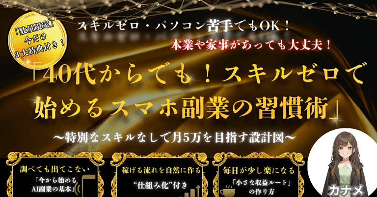 3大特典付き!【40代からでも!スキルゼロで始めるスマホ副業の習慣術】 〜特別なスキルなしで月5万を目指す設計図〜