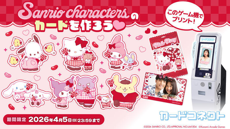 サンリオキャラクターのコラボデザインイベントが、アミューズメント施設向けのカードプリントゲーム機「カードコネクト」にて2026年2月2日より開催中だ。赤とピンクのキャンディをモチーフとした、キュートなデザインのカードを印刷できる。